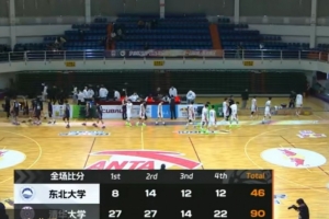 末节比赛,东北大学进攻回暖,连投带罚拿分努力追赶,但清华大学外线开火,许熙桐和何文炜先后飙中三分扩大领先,东北大学火力无法延续,清华大学继续拉开分差,最终,清华大学90-46以44分的优势大胜东北大学。
